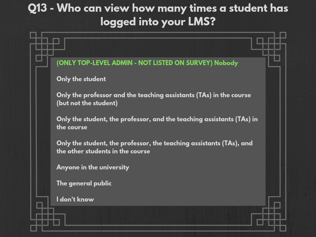 Correct answers are in accordance to interviews with top-level IT administrators at CU Boulder, UCCS, and CU Denver. Answers correspond to the LMS Canvas, and not to other systems, though the configurations of Canvas were modeled off of previously-used LMSs (D2L at CU Boulder, and Blackboard at UCCS were mentioned), so it is not out of the question to assume similar settings for different systems. Answers vary slightly across schools, but are overall very similar.