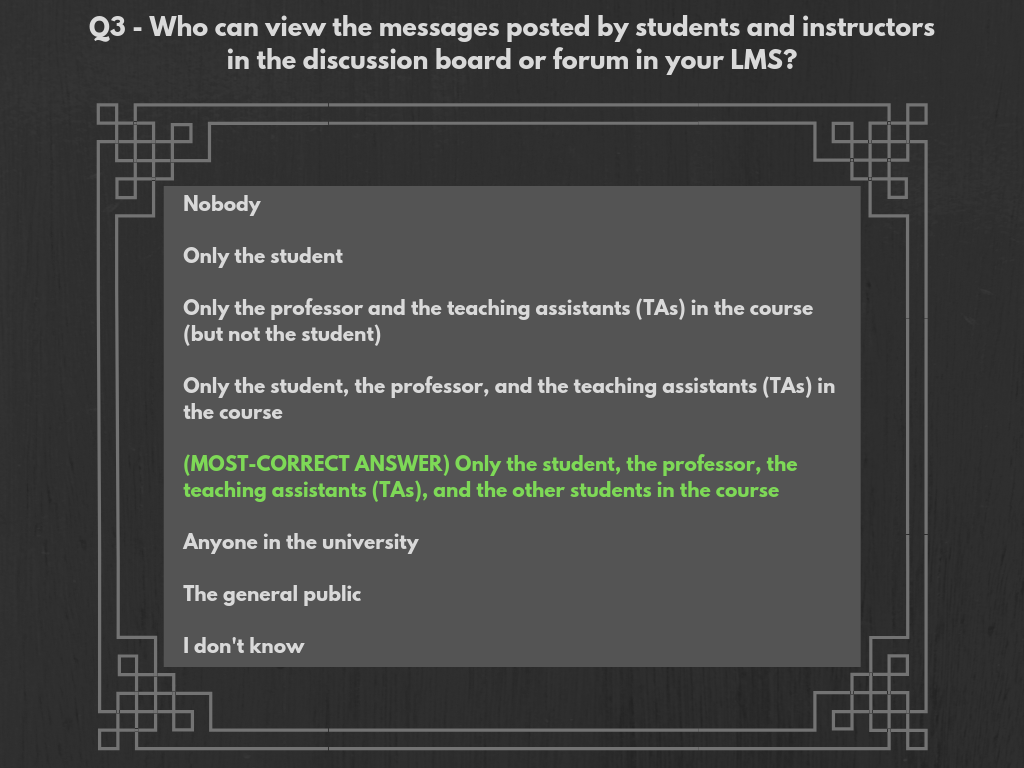 Most-Correct Survey Response Choice: “Only the student, the professor, the teaching assistants (TAs), and the other students in the course.”